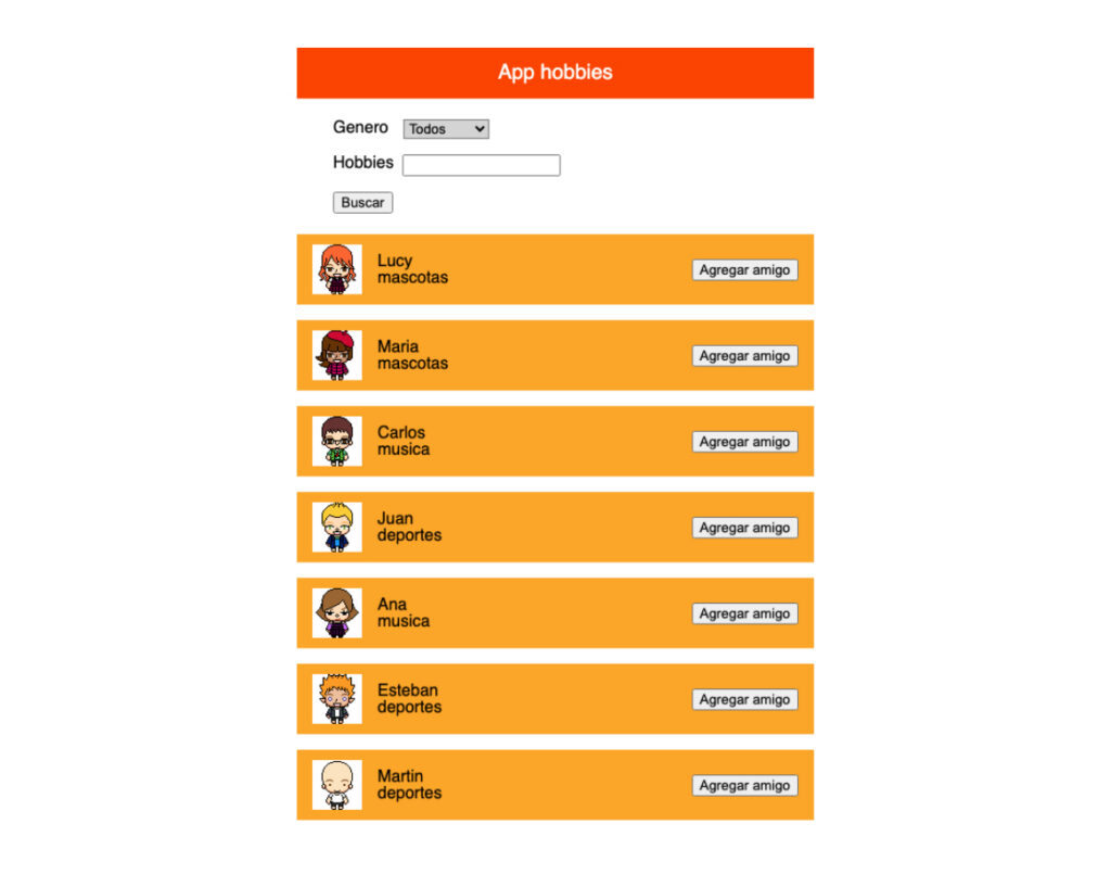 This project is done using basic javascript parameters to achieve search results, taking into account the generator and people’s hobbies. By clicking on Gender filtered by all, male or female. When writing the Hobbys it will filter by the selected one. Html and css found with flexbox.