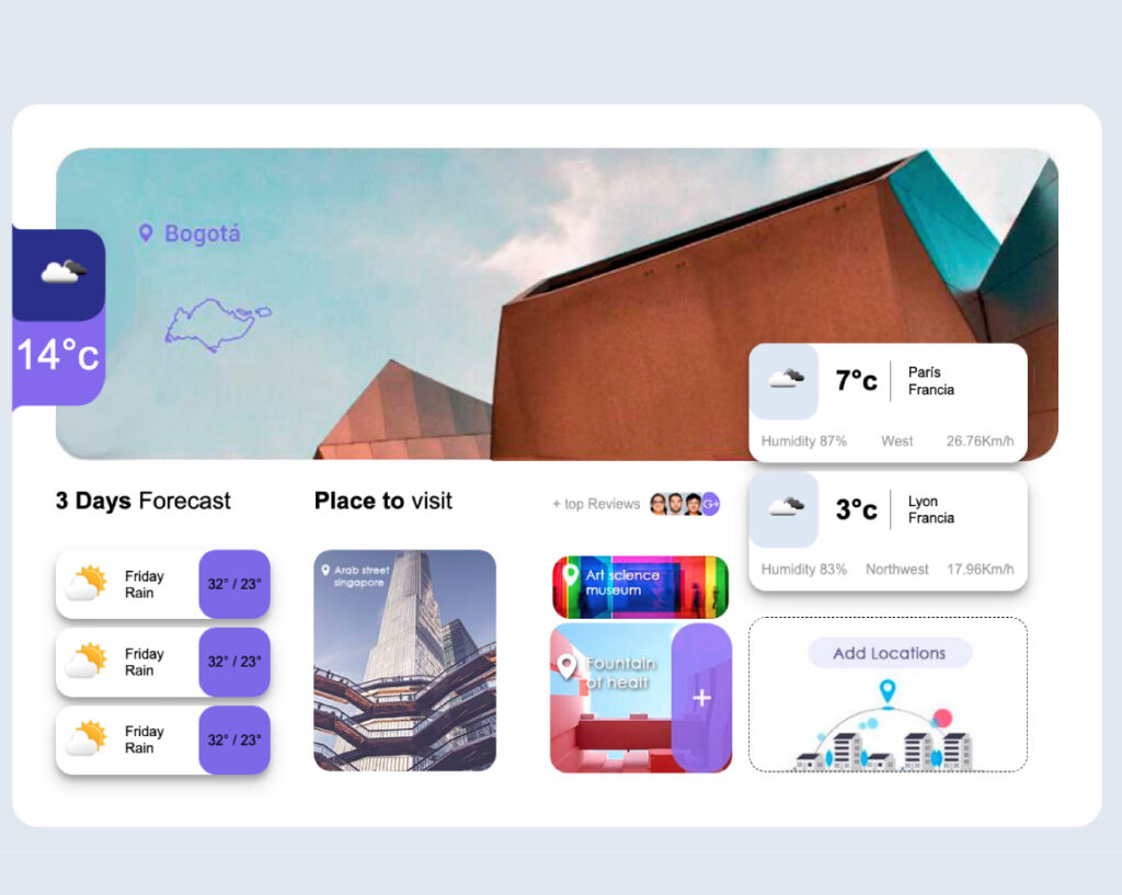 Make an App that allows knowing the climate of the cities of Bogotá, France and Lyon, with their respective icons according to the appi data from https://openweathermap.org/current. was done using Html5, Css3, flexbox, first mobile design, sass and JavaScript. Design made for mobile, tablet and desktop.